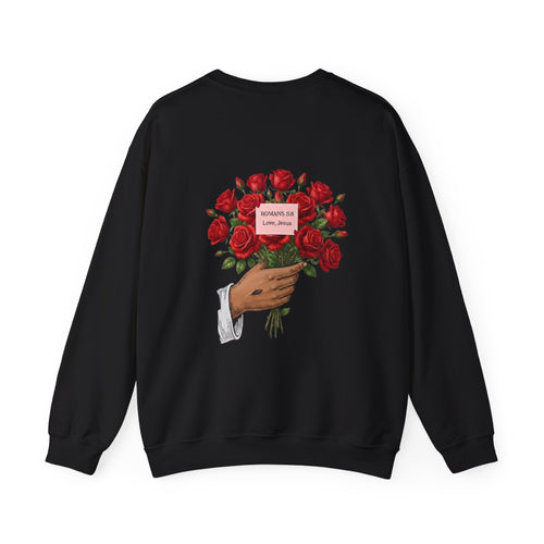 Crewneck Sweatshirt — Vintage Red Rose Bouquet with Broken Heart & 'Romance Is Love, Jesus' Design